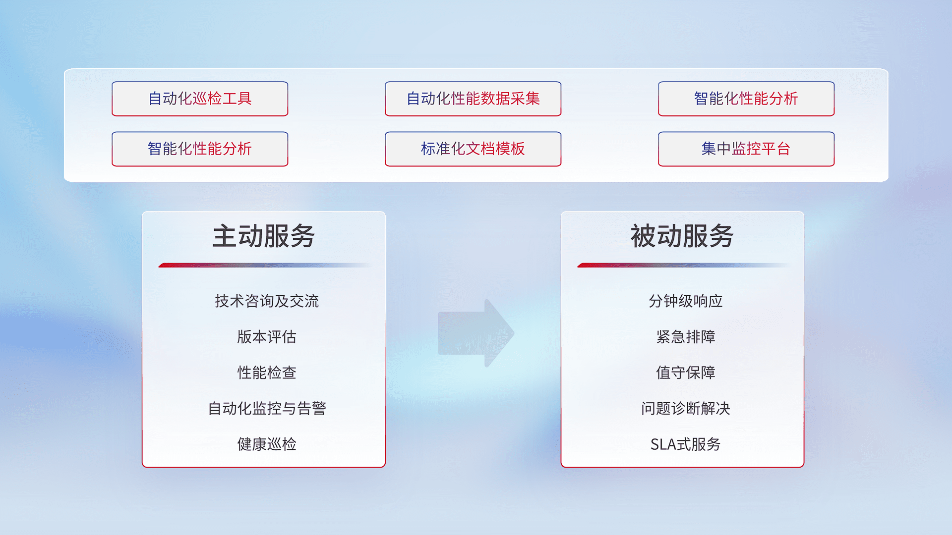 智能化工具和标准化文档,,,保障服务质量,,提供主动服务(包含技术咨询、、、、版本评估、、、性能检查、、自动化监控与告警、、、、健康巡检)和被动服务包含(分钟级响应、、、紧急排障、、、值守保障、、、、问题诊断解决、、、、SLA服务)。。。