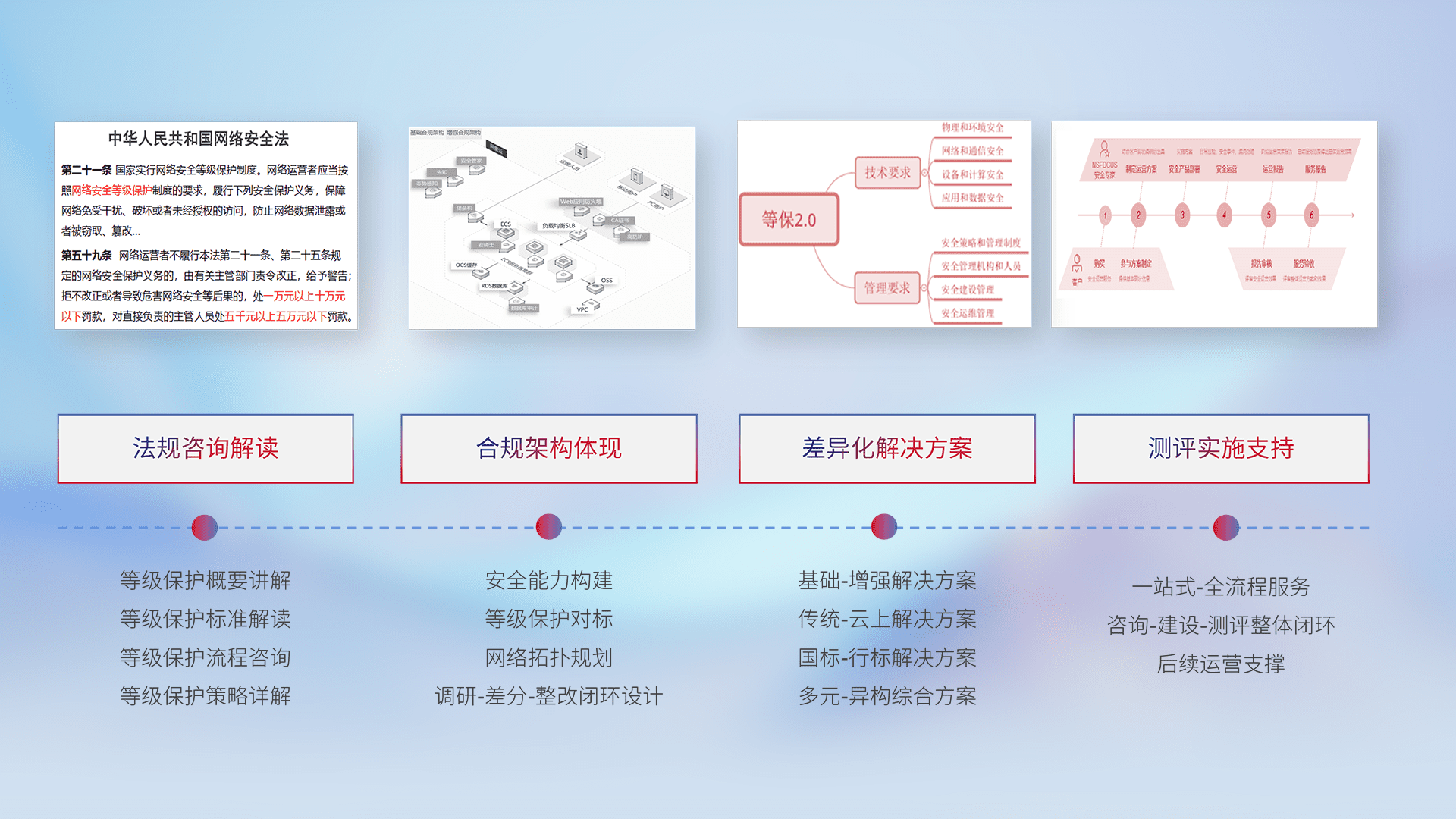 通过专业的法律咨询解读、、合规架构体现、、、差异化解决方案、、测试实施支持等服务,,,,为客户量身打造等保合规体系。。。。